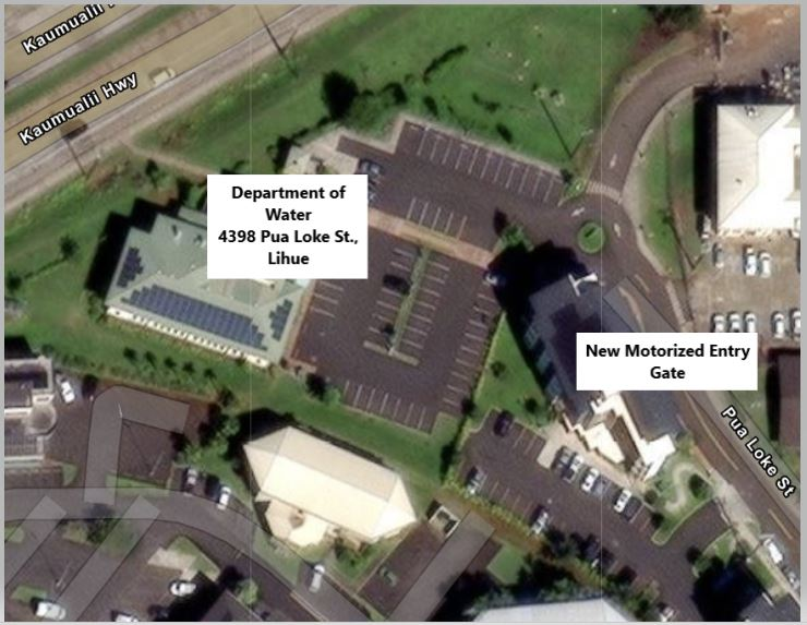 LĪHU‘E – The Department of Water (DOW) has completed construction of its new, motorized entry gate to the main entrance of its administrative building’s parking lot. The bill payment drop box located in the DOW parking lot, at 4398 Pua Loke Street in Līhuʻe, will be accessible from Monday through Friday, 6 a.m. to 4:30 p.m., except holidays.