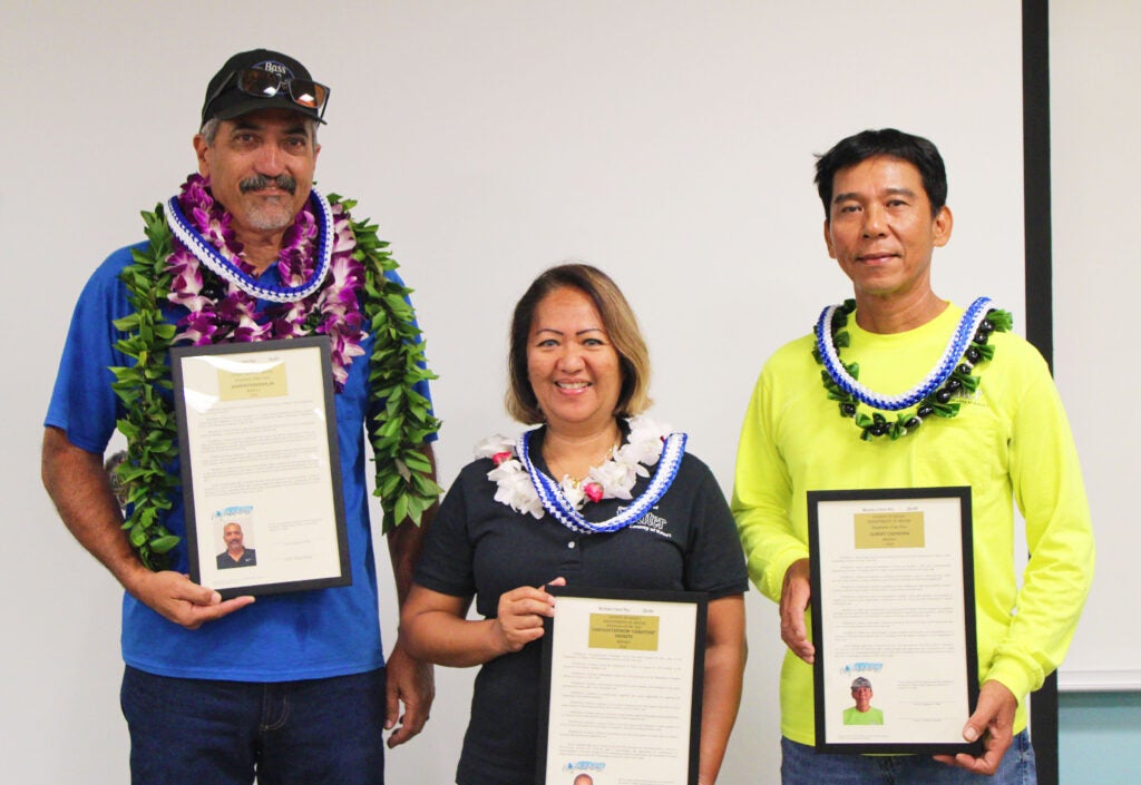 From left: DOWʻs 2025 Outstanding Employees of the Year Joseph (Jay) Perreira, Jr., Chrysanthemum (Christine) Erorita, and Albert Cadavona.