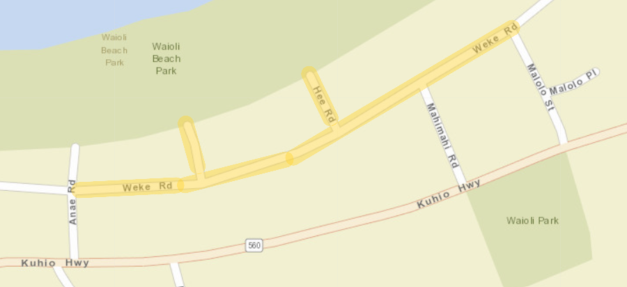 11:05 a.m. 04-17-2026 HANALEI – Emergency water service shutdown on a portion of Weke Road, between Anae Road and Malolo Street, including branching roads and Hee Road, for approximately 2 hours. DOW crews are repairing a service lateral.