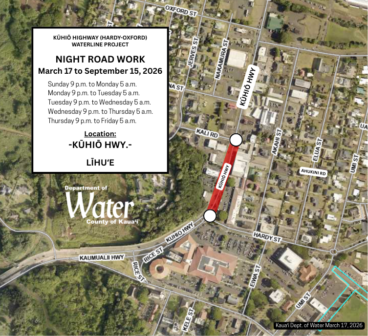The night work will continue from March 17 to September 15, 2026, weekdays from 9 p.m. to 5 a.m., weather permitting, for the Kūhiō Highway (Hardy-Oxford) Waterline Project. This project involves upgrading the aging water main infrastructure to meet current Water System Standards, including fire flow requirements.