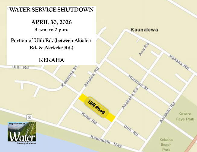 KEKAHA – The Department of Water (DOW) advises customers in Kekaha of a scheduled water service shutdown on a portion of Ulili Road (between Akialoa Road and Akekeke Road) on Thursday, April 30, from 9 a.m. to 2 p.m., weather permitting.