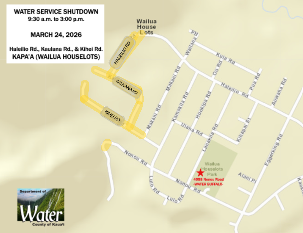 KAPAʻA (Wailua Houselots) – The Department of Water (DOW) has scheduled a water service shutdown on Tuesday, March 24, 2026, from 9:30 a.m. to approximately 3:00 p.m., weather permitting. The affected areas will be a portion of Haleilio Road (from Sleeping Giant Trailhead to Kaulana Road), Kaulana Road, and a portion of Kihei Road (from Kaulana Road to the cul-de-sac). The shutdown will allow DOW crews to install a pressure release valve. A water buffalo providing potable (drinking) water will be available at Wailua Houselots Park 4988 Nonou Road. Customers must bring their own water containers.
