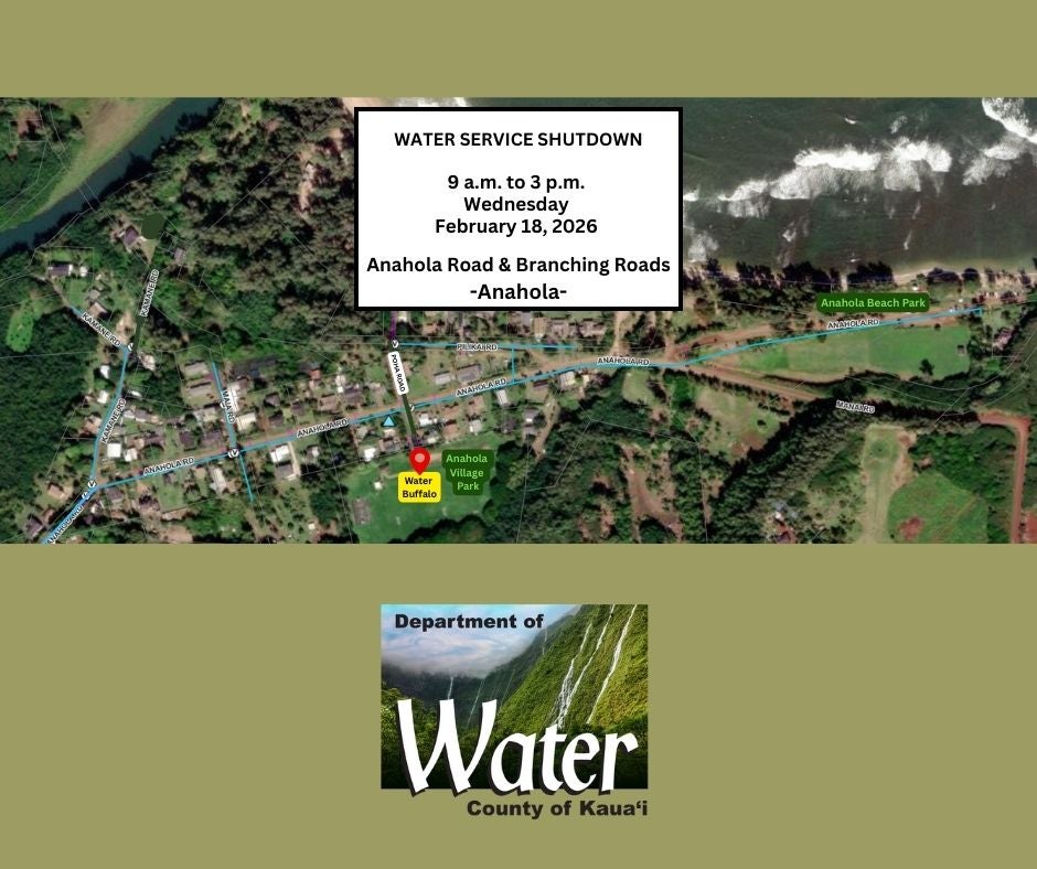 Water service shutdown scheduled on a portion of Anahola Road on Feb. 18