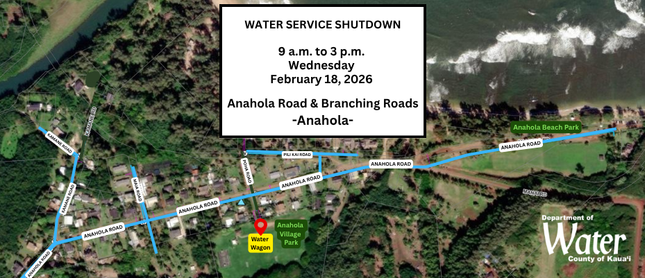 ANAHOLA – The Department of Water (DOW) and contractor Cushnie Construction Company Inc. have scheduled a water service shutdown on a portion of Anahola Road to perform water system improvements. The affected area will be from 4373 and 4374 Anahola Road and extend to Anahola Beach Park. Branching roads affected will be Kamane Road, Maia Road, and Pili Kai Road.